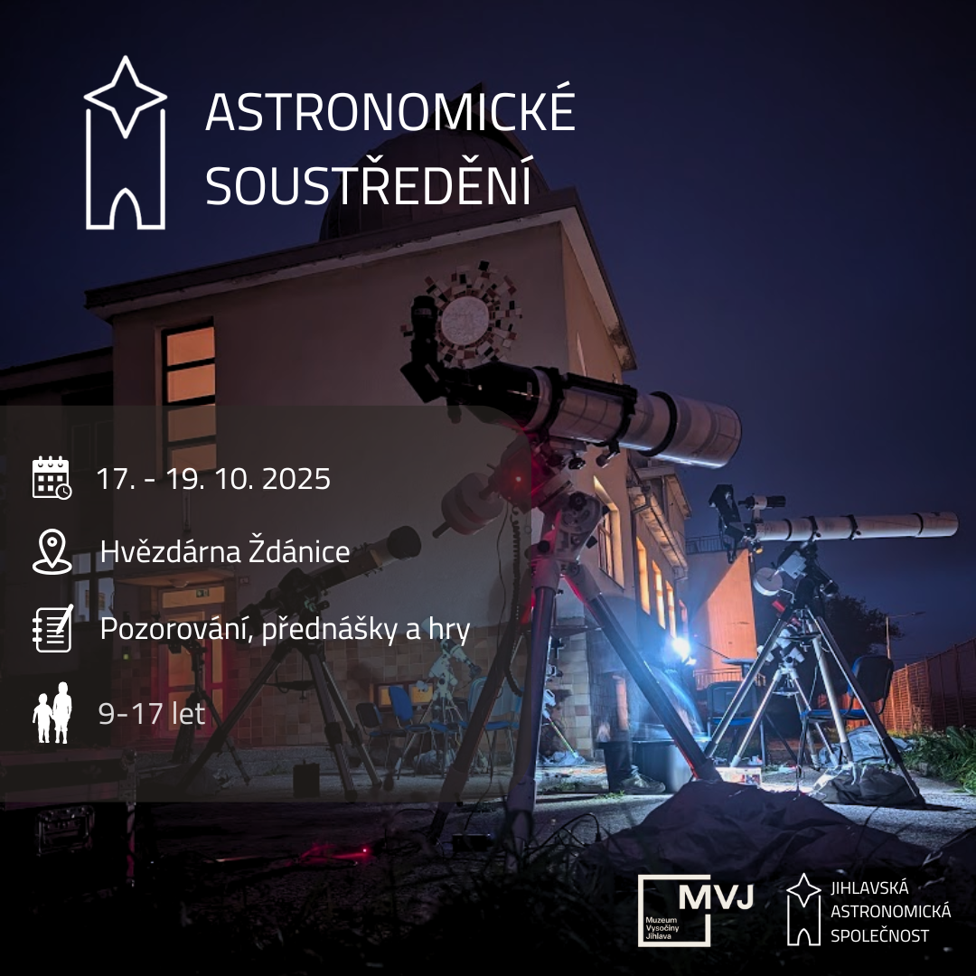 Podzimní astronomické soustředění 2025 se uskuteční od pátku 17. října 2025 od 14:00 do neděle 19. října 2025 do 13:00 v prostorách Hvězdárny a planetária Oldřicha Kotíka ve Ždánicích (viz https://www.hvezdarnazdanice.cz/). Letos se nám bohužel nepodařilo najít vhodný termín prodlouženého víkendu (státní svátek či podzimní prázdniny). Přijet však můžete už ve čtvrtek 16. října 2025 od 17:00; organizátoři budou na místě a až do oficiálního zahájení bude volnější program. Pokud bude jasno, využijeme noc ze čtvrtka na pátek k ustavení astronomických dalekohledů a prvnímu pozorování, jinak budeme hrát deskové hry a v pátek dopoledne vyrazíme na procházku po malebném okolí Ždánic. Chápeme, že pátek je školní den, proto oficiálně začínáme až odpoledne a čtvrteční příjezd je zcela dobrovolný, ale nudit se určitě nebudeme 😊. Společné stravování bude zajištěno od páteční snídaně.